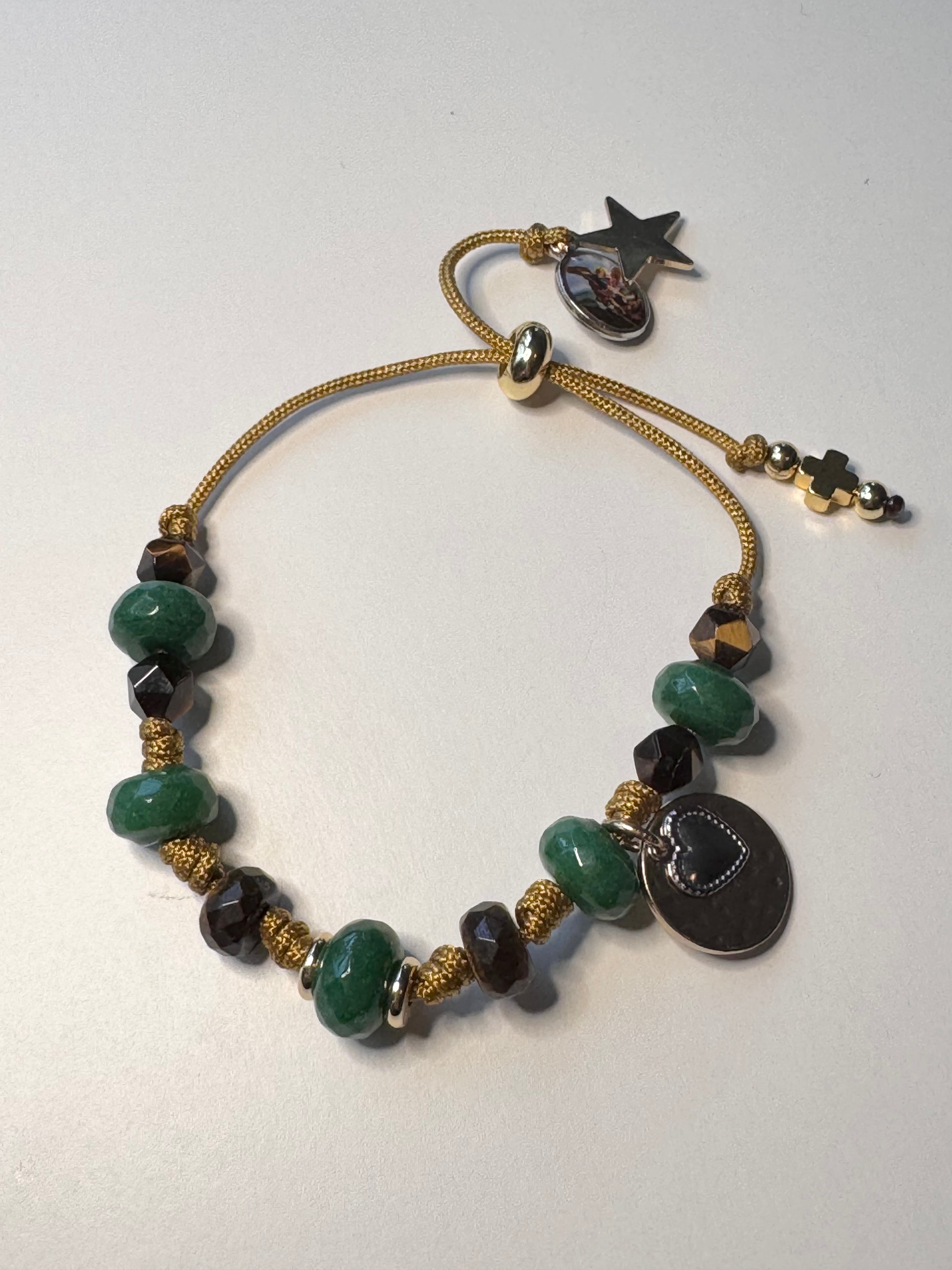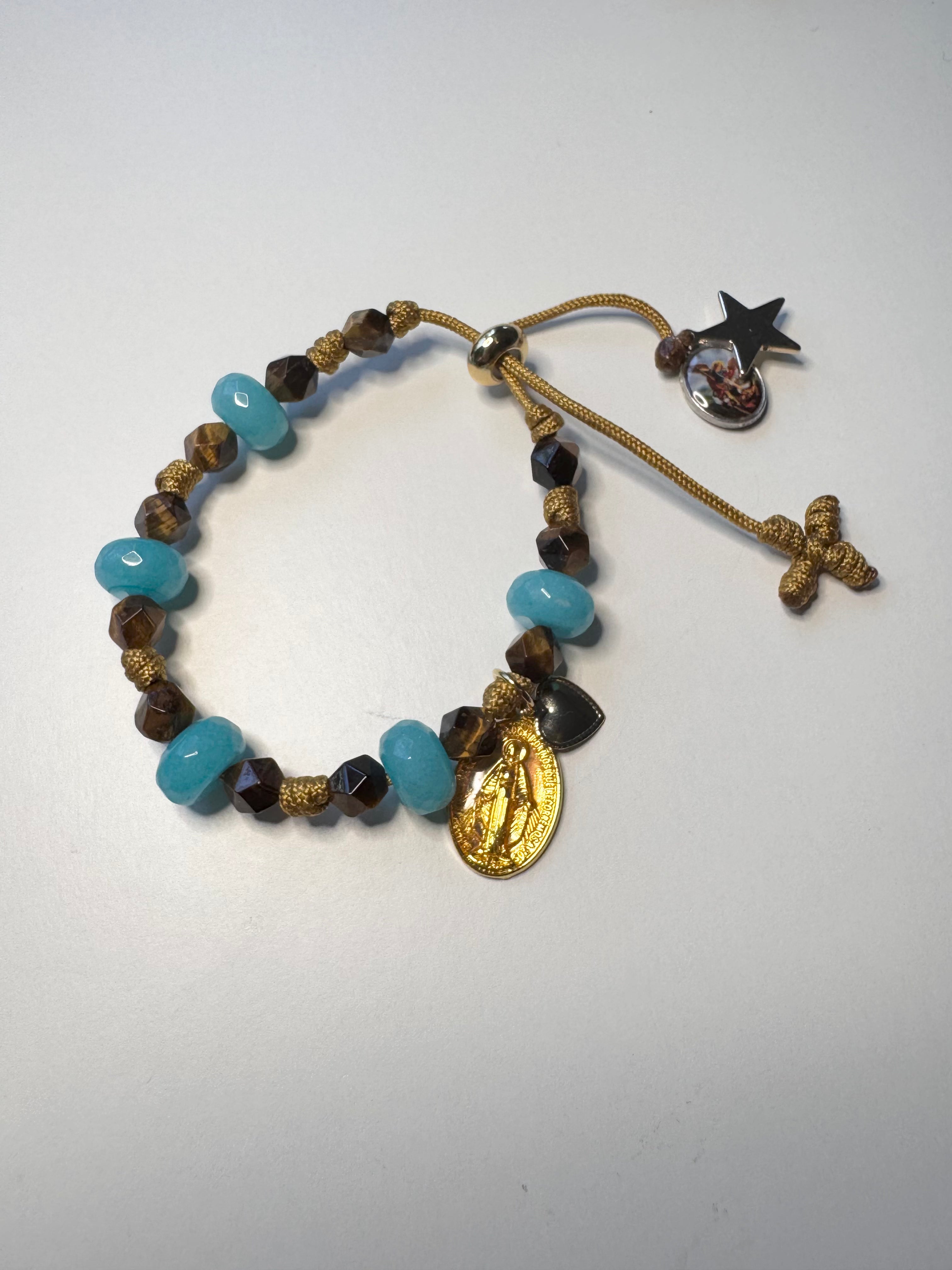 Pulsera ajustable de piedras naturales con detalles de medallas religiosas