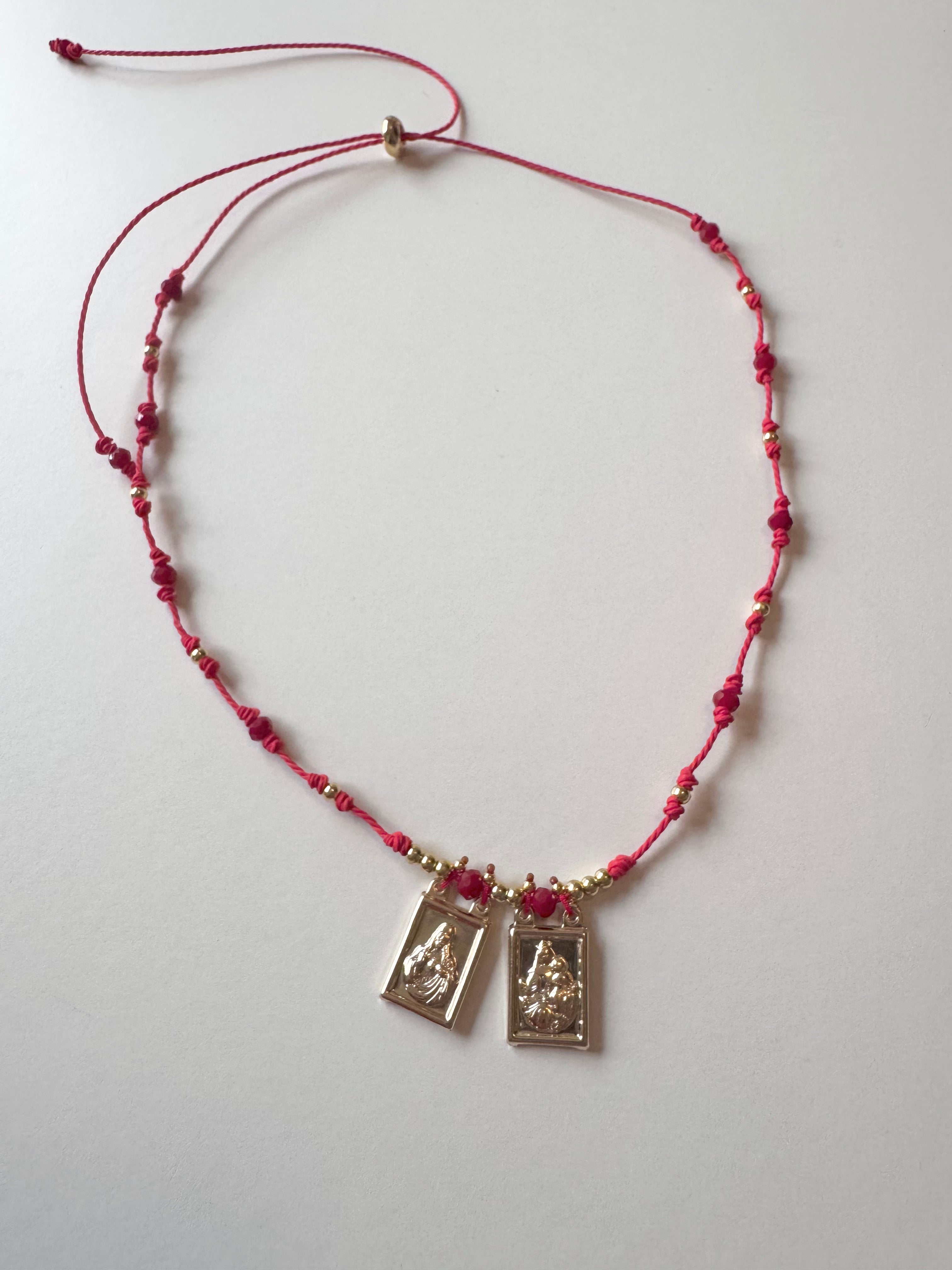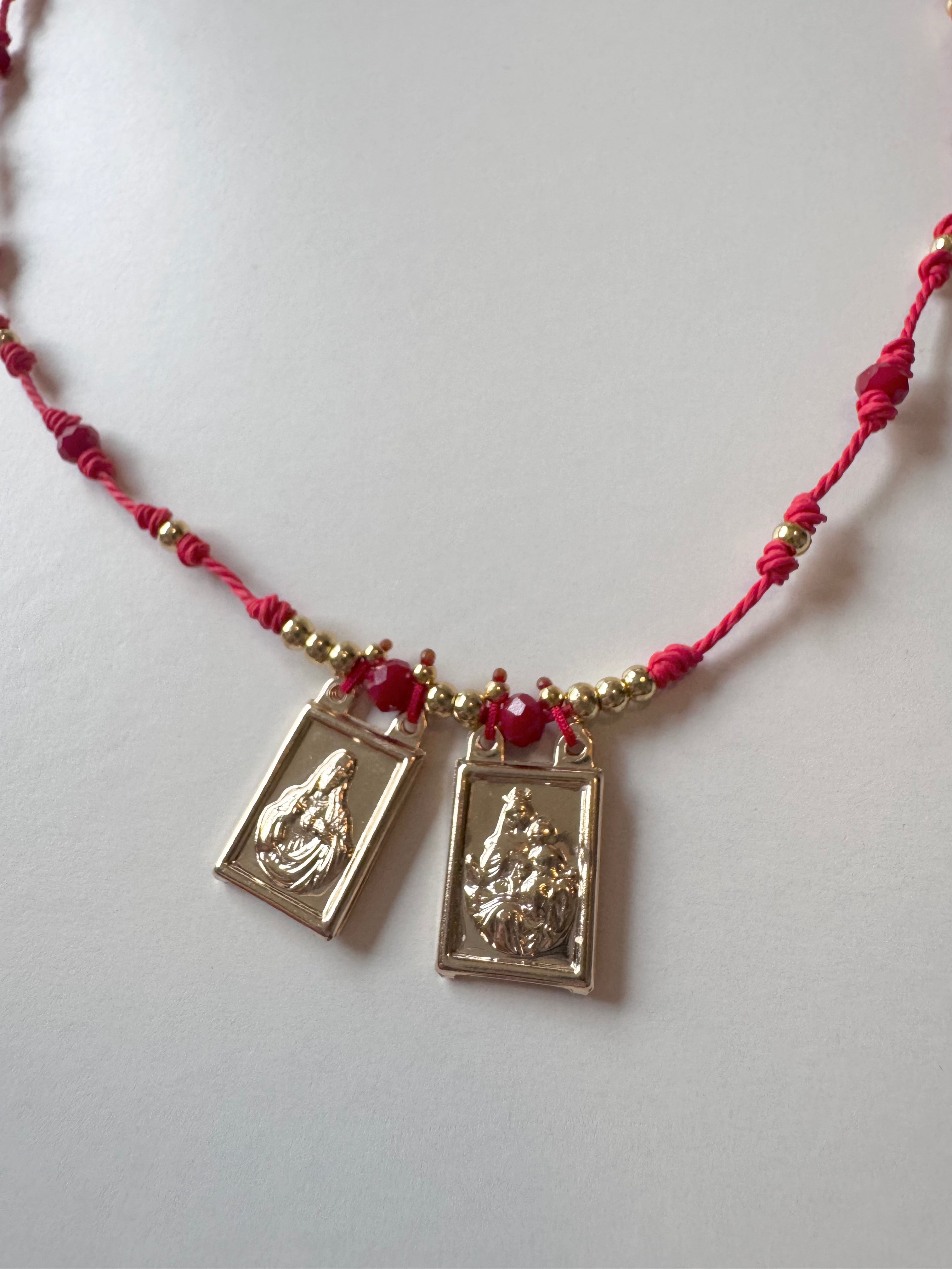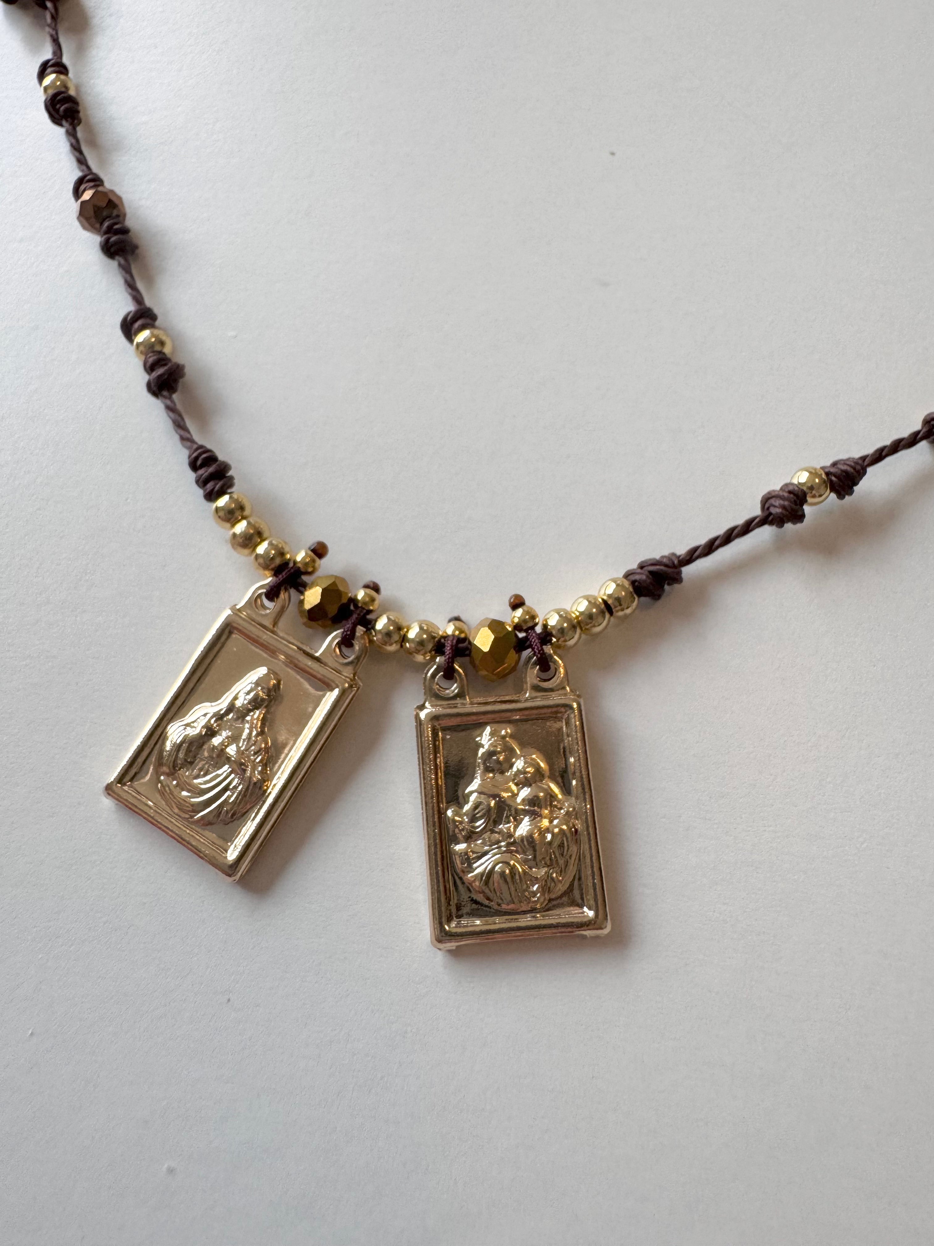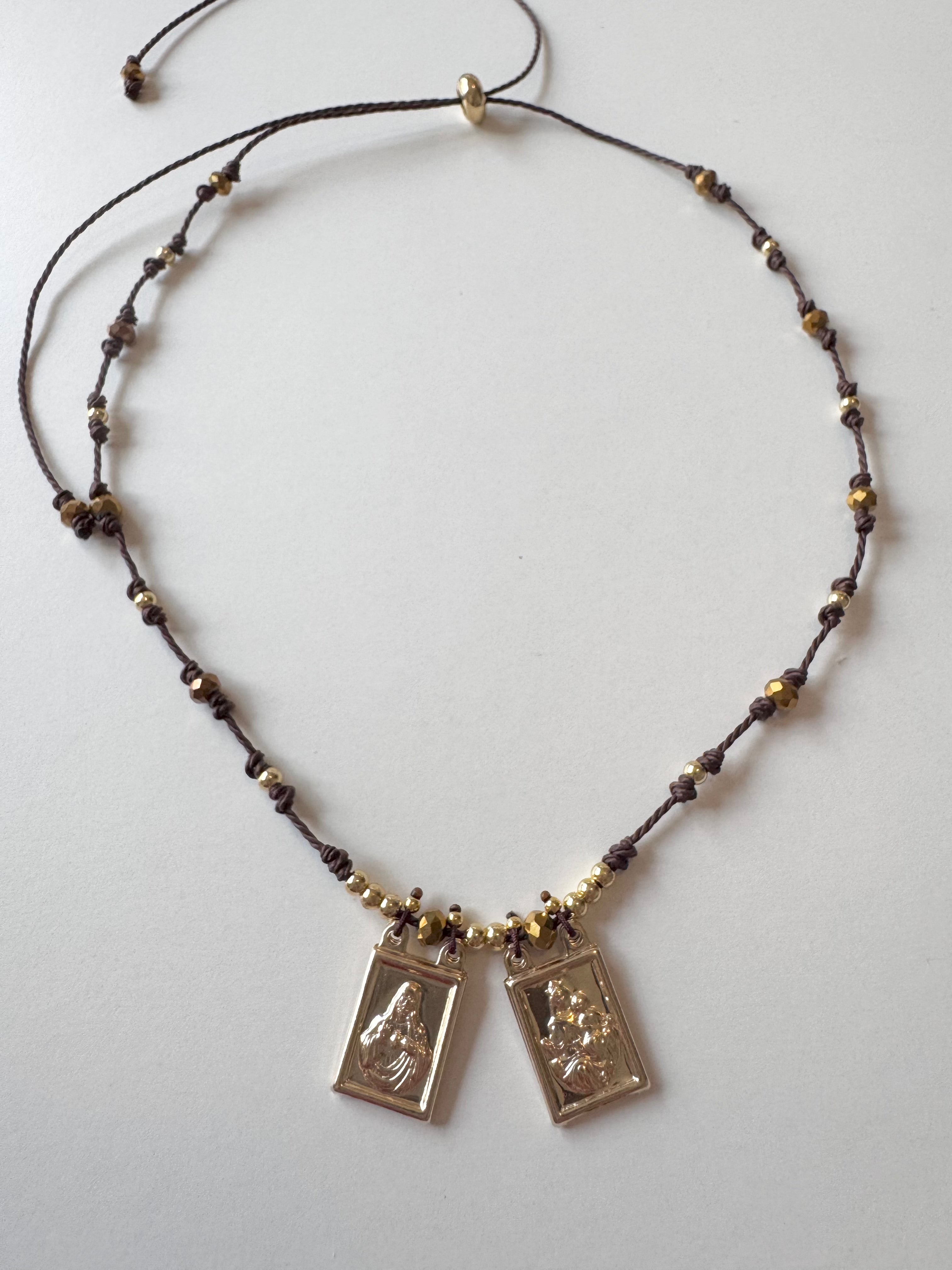 Hermoso collar ajustables en tonos marrones o rojo con medallas cuadradas del Sagrado Corazón de Jesús y Virgen del Carmen.